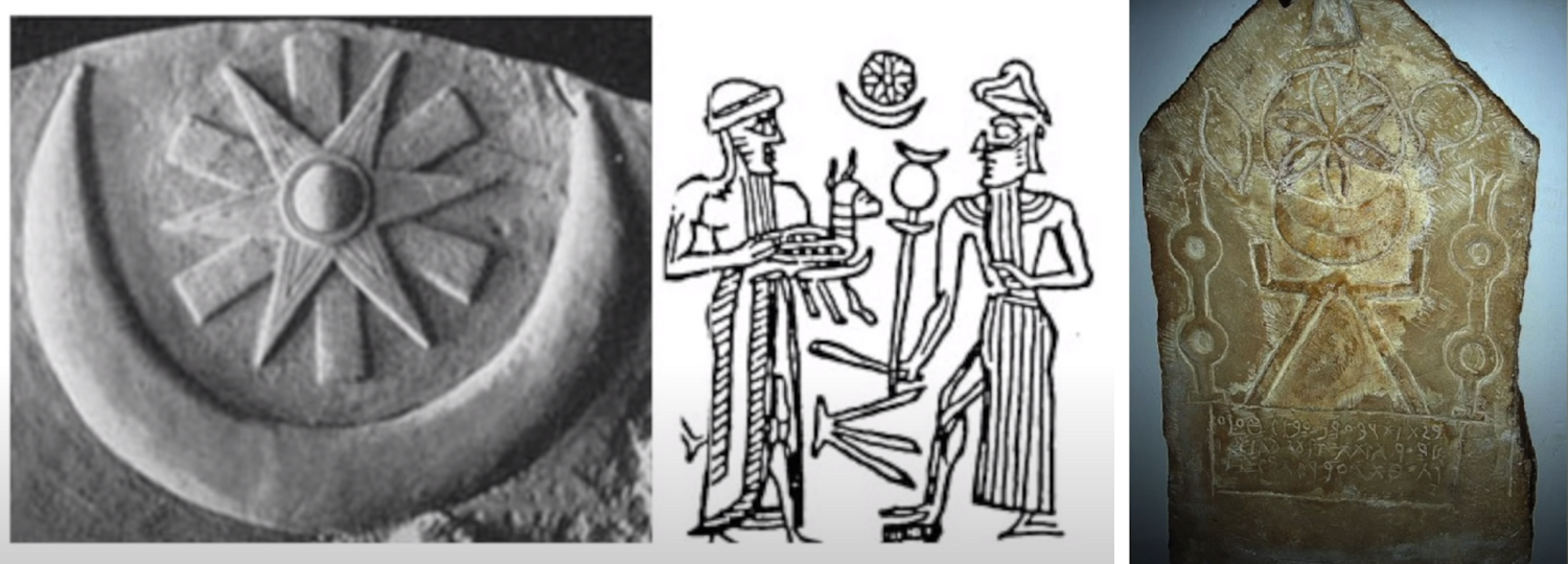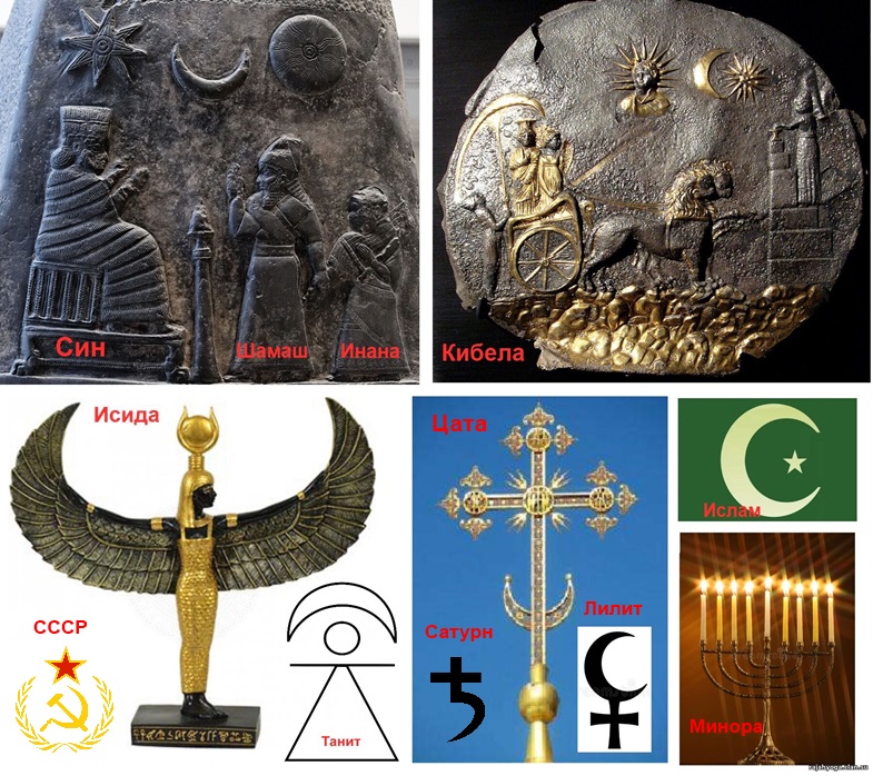 Подобная история с кастрацией Эля произошла и на Востоке, там Ila (Эль) считается прародителем лунной династии. Ilā — андрогин в индуизме, персонаж индуистской мифологии, изменяющий свой пол. В своей мужской форме он известен как Судьюмна, а в своём женском обличье как Ила. Ила считается прародителем древнеиндийской Лунной династии (из которой Кришна), царей которой также называют айлами («потомками Илы»). Ила дочь или сын Вайвасваты Ману и сестра или брат основателя Солнечной династии Икшваку. Ила став женщиной вышла замуж за Буддхи - сын бога Луны Сомы. В мифологии Малой Азии тоже есть история про кастрацию родоначальника богов. Агдистис гермафродит, сын Зевса, которого за его мощь андрогина боялись боги, поэтому боги кастрировали его и из его крови появился Аттис, в которого впоследствии влюбился Агдистис уже ставший женщиной Кибелой. После самокастрации Аттиса и его гибели Кибела становится матерью богов. Можно было б подумать, что это просто совпадение легенд, но в Пессиносе во Фригии Кибела приняла форму бесформенного камня из черного метеоритного железа, который потом стащили римляне т.к. оракул сказал им, что победить мешающих римлянам обрести мировое господство карфагенян они смогу только если начнут поклоняться карфагенской богине Кибеле и тогда римляне выкрали камень Кибелы и стали ей поклоняться и на самом деле разрушили Карфаген. Кстати, основная святыня ислама тоже метеоритный камень! Но чёрный камень (метеорит) считался священным задолго до появления ислама. Он долгое время ассоциировался с Каабой, которая была построена в доисламский период и была местом паломничества языческого народа набатеев, которые посещали святыню раз в год. Вокруг Каабы находились 360 идолов, построенных намного позже неё и предположительно олицетворявших дни года, а сам храм был посвящён набатейскому божеству Хубалу. Хубала от общесемитического слова b’l Баал («хозяин», «владыка»). Хубал бог арабского языческого пантеона, особо почитавшийся в Мекке в доисламскую эпоху племенем курайш, из которого происходил пророк Мухаммад. Считался у арабов божеством предков, богом неба и луны. Его спутницами были: богиня Аль-Лат божество войны (подземного мира, у шумеров она Эрешкигаль), богиня утренней звезды Аль-Узза (отождествлялась с греческой богиней Афродитой Уранией, Каменный куб в Ат-Таифе близ Мекки считался священным как часть ее культа), богиня судьбы Аль Манат (старейшая из троицы, богиня возмездия и загробного мира, отождествлялась с греко-римской богиней Немезидой, белый гранитный камень с украшениями, почитался как его покровительница). Кстати, трёхликая богиня ещё и Геката (богиня антимира). А символ ислама звезда и полумесяц известен был со времён Шумера за 3 тыс. лет до ислама Так что получается, что уже в нескольких пантеонах центральное божество лунное, а его паства должна или обрезаться, или кастрироваться, а значит это инь, тянущий на себя ян энергию. В этих религиях поклоняются кубу, Каабе. А древние евреи поклонялись Ремфану (Сатурну), символ которого тоже куб = 6-конечная звезда. Подробнее про символизм Сатурна у Д. Айка.