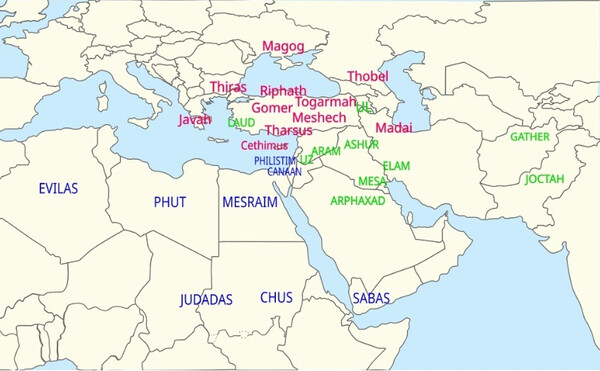 - А Иафет самый плодовитый, от него народы Сирии, Малой Азии, территории Аральского и Каспийского морей, европейцы – галлы, тевтоны (германцы), британцы; русичи, украинцы, тюрки, скифы, кавказцы, грузины, армяне, дагестанцы, иранцы, арийцы, греки, фракийцы (Балканы), турки и др.